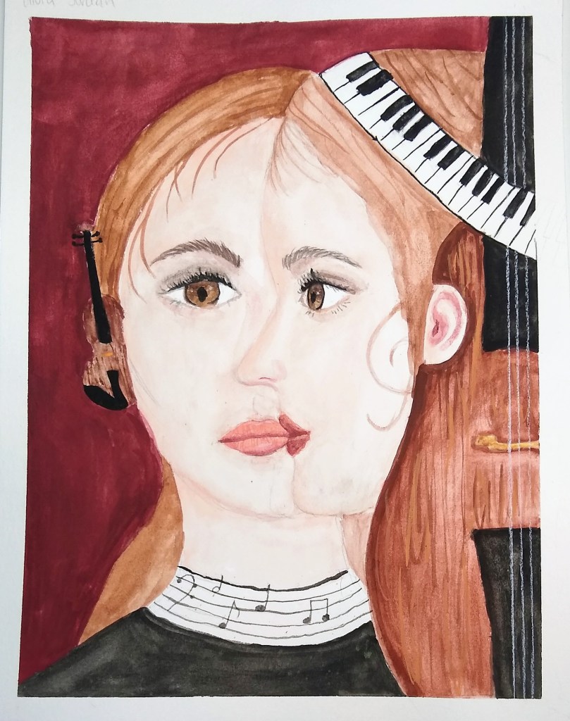 This original watercolor painting explores the connection between music and identity through a symbolic portrait. I used a split face composition, integrating the neck and strings of a cello into one side of the figure, while a piano keyboard blends into the hair at the top of the head. A small violin appears in the background, and musical notation wraps around the neck like a collar, surrounding the figure with sound and rhythm.